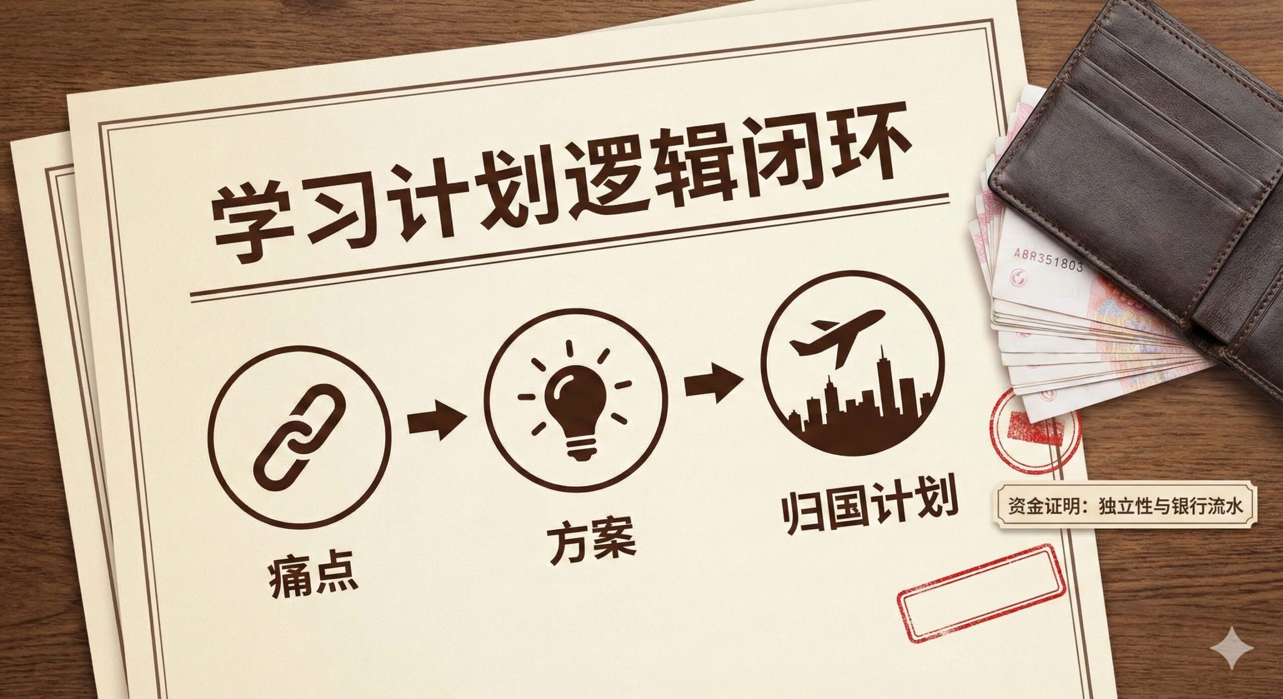'方案(灯泡)' -> '归国计划(回国航班/城市剪影)'。旁边有一个钱包和一叠钞票(象征资金证明),强调'独立性'和'银行流水',突显成熟申请人的形象。整体采用米色和红色印章,模拟官方文件的庄重感,增加可信度。”>